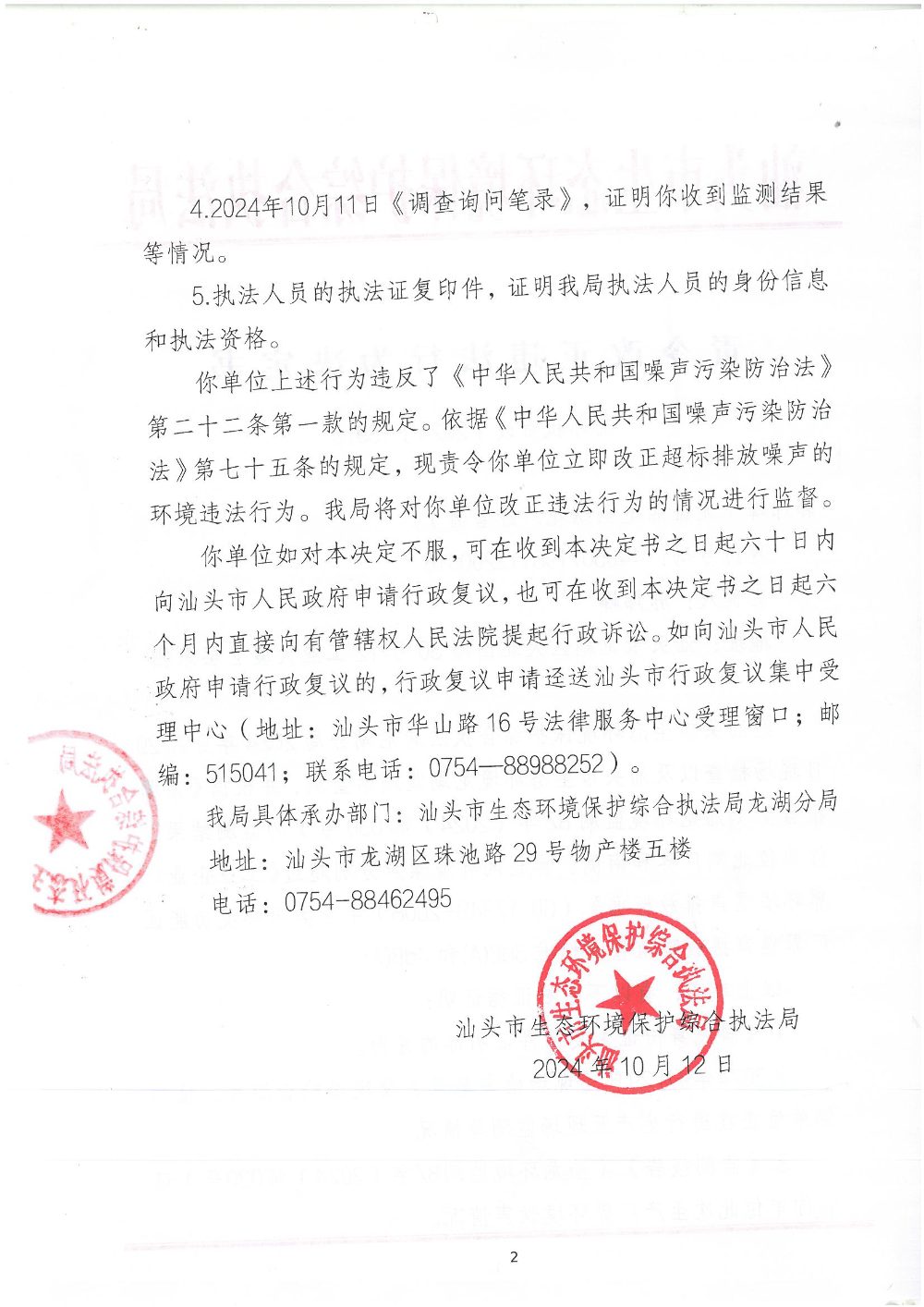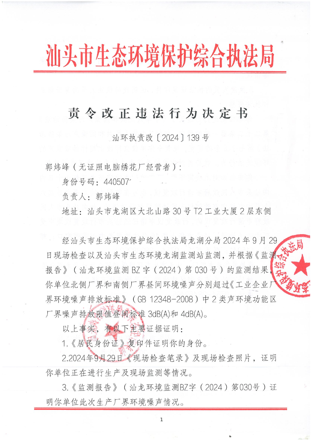 【龙湖】责令改正违法行为决定书(汕环执责改〔2024〕139号)