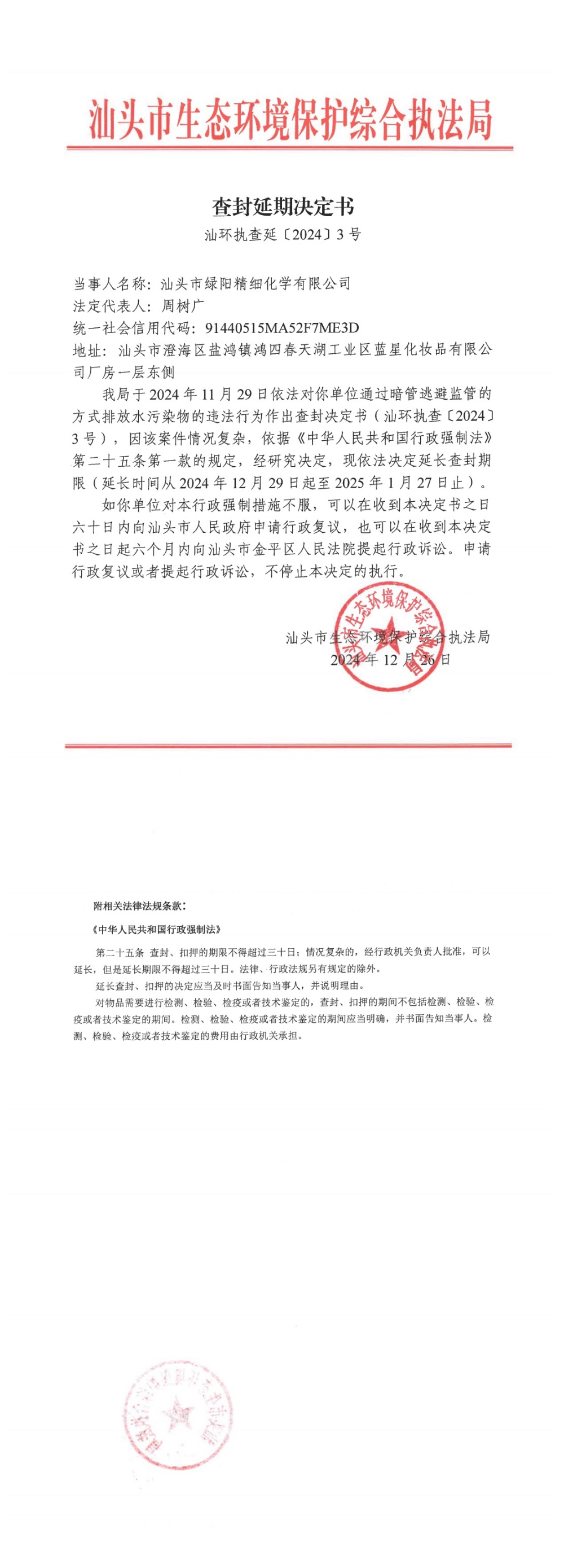 【澄海】查封延期决定书(汕环执查延〔2024〕3号)