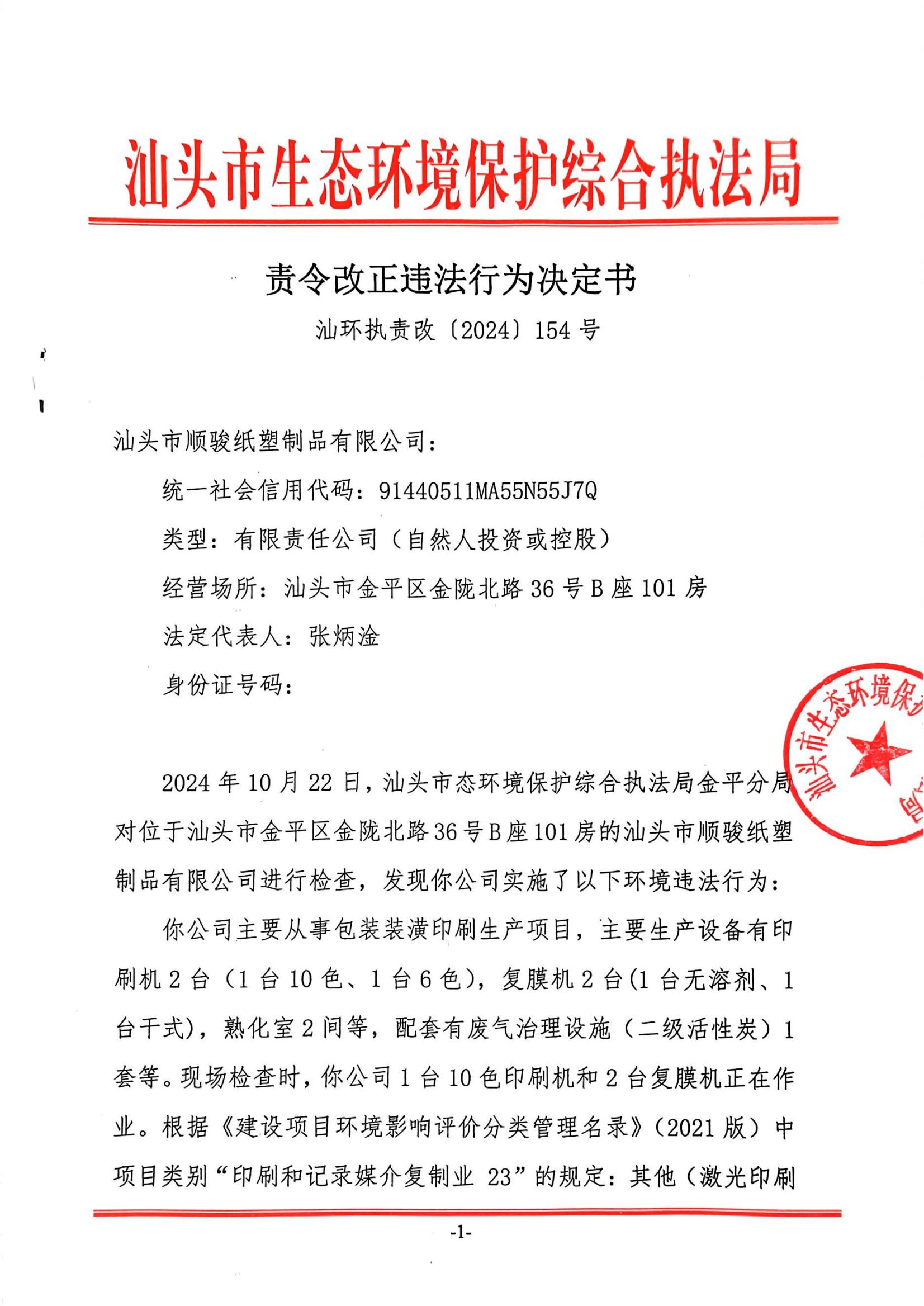 【金平】责令改正违法行为决定书(汕环执责改〔2024〕154号)
