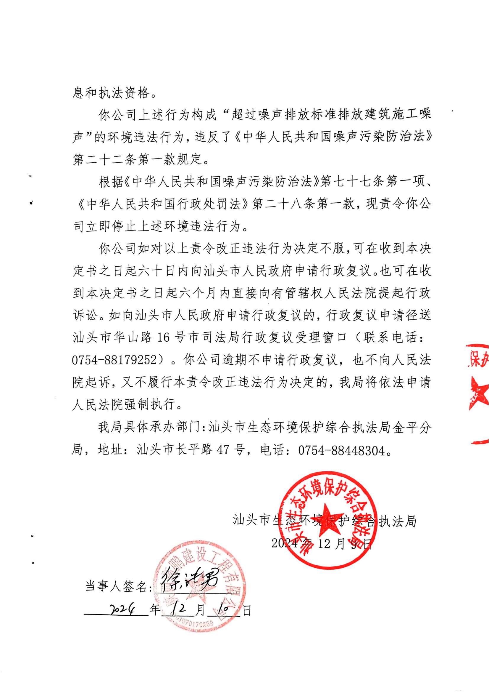 【金平】责令改正违法行为决定书(汕环执责改〔2024〕204号)