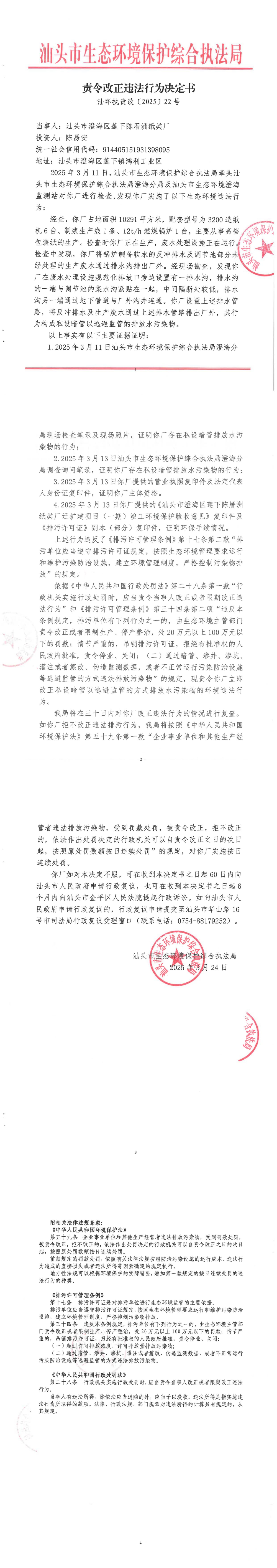 【澄海】责令改正违法行为决定书(汕环执责改〔2025〕22号)