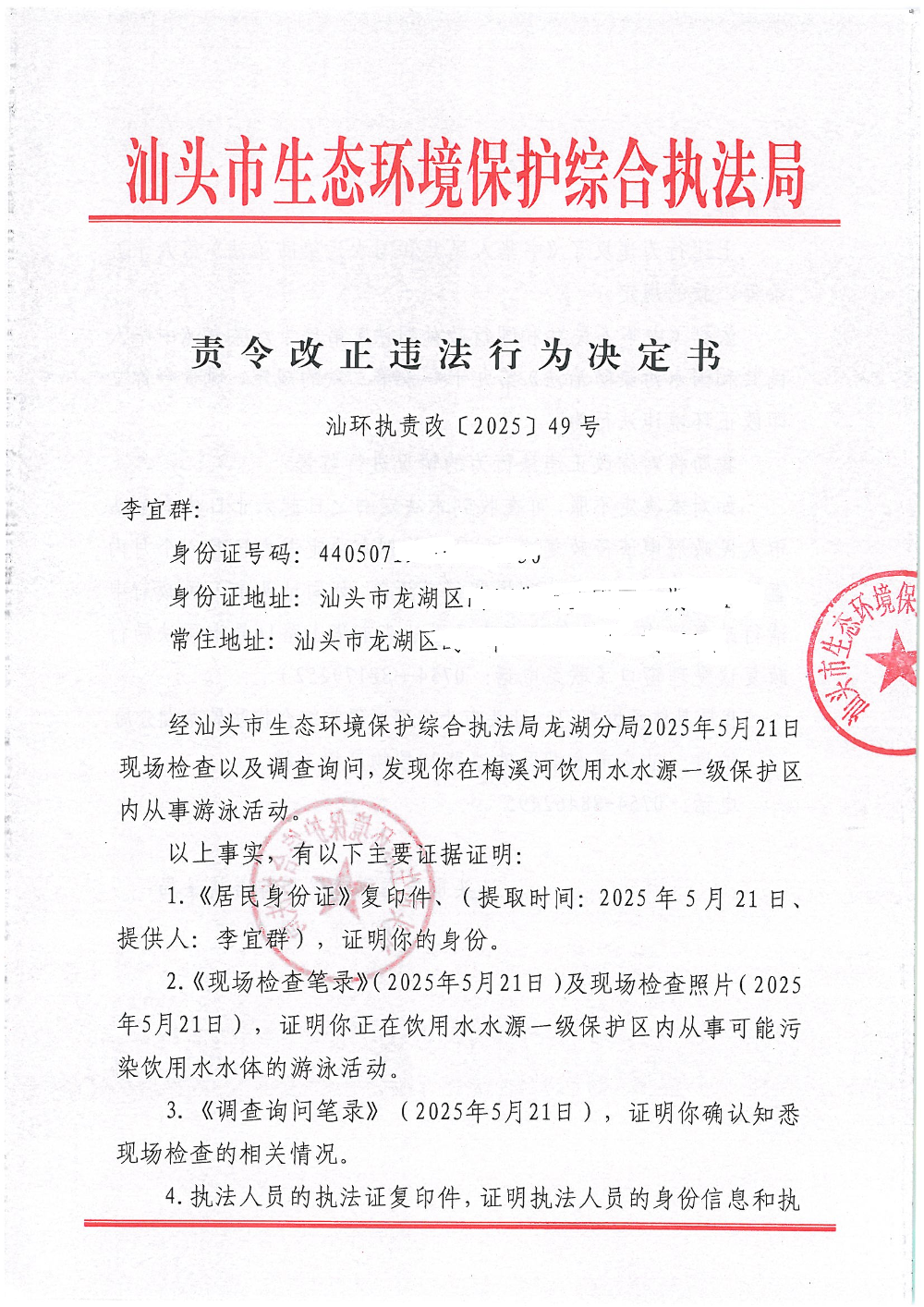 【龙湖】责令改正违法行为决定书(汕环执责改〔2025〕49号)