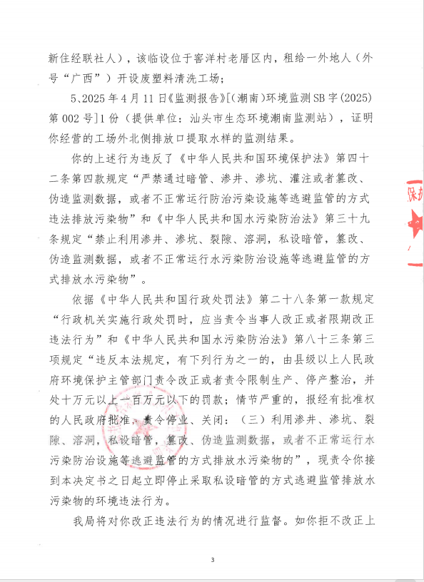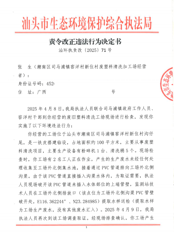 【潮南】责令改正违法行为决定书(汕环执责改〔2025〕71号)