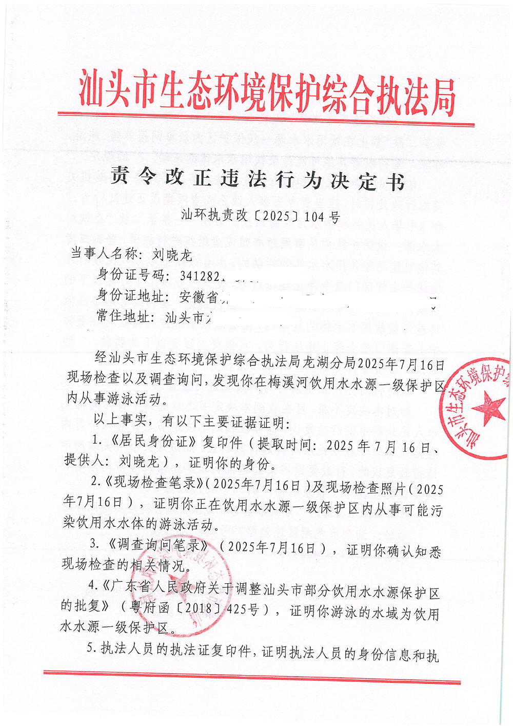 【龙湖】责令改正违法行为决定书(汕环执责改〔2025〕104号)
