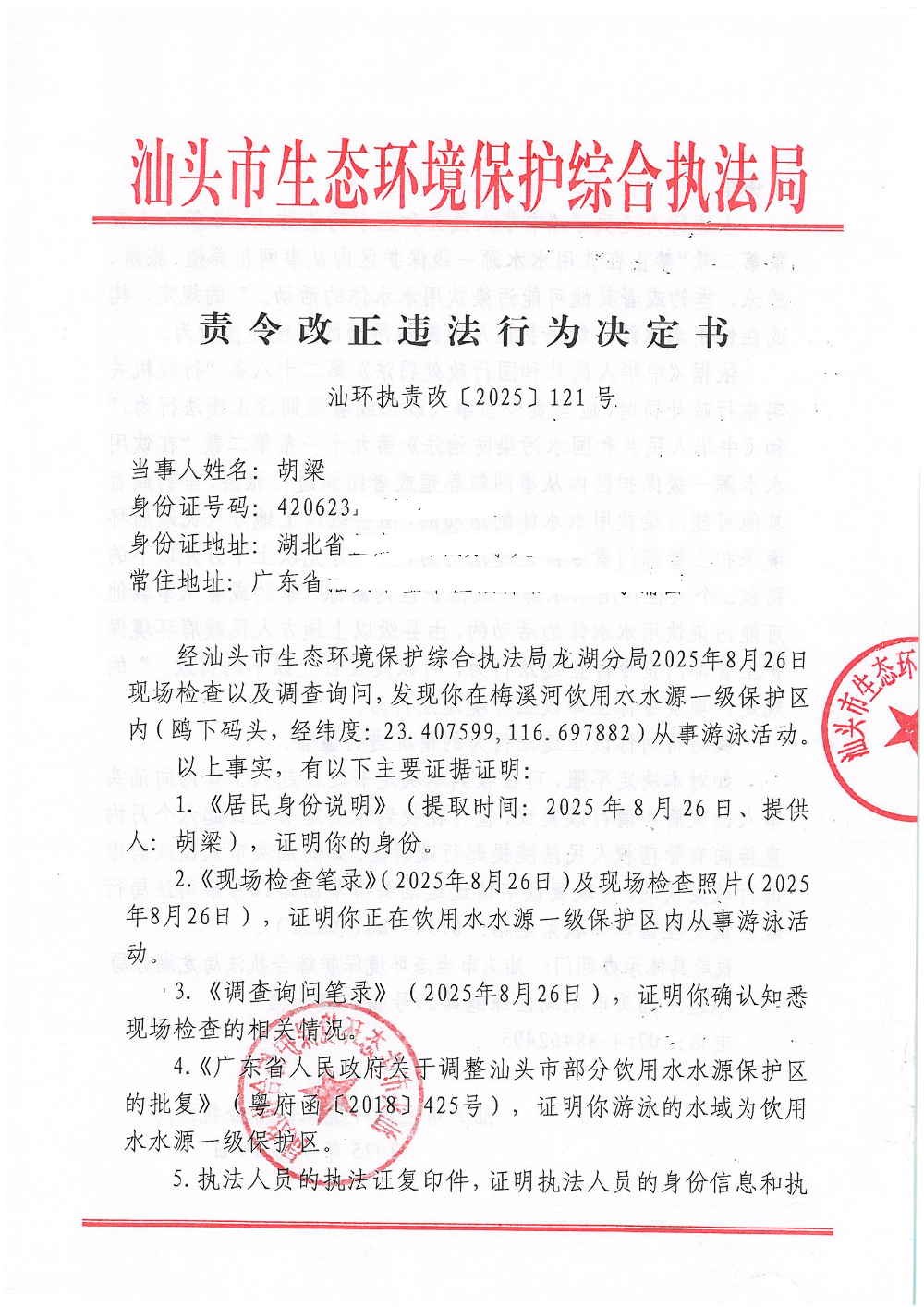 【龙湖】责令改正违法行为决定书(汕环执责改〔2025〕121号)
