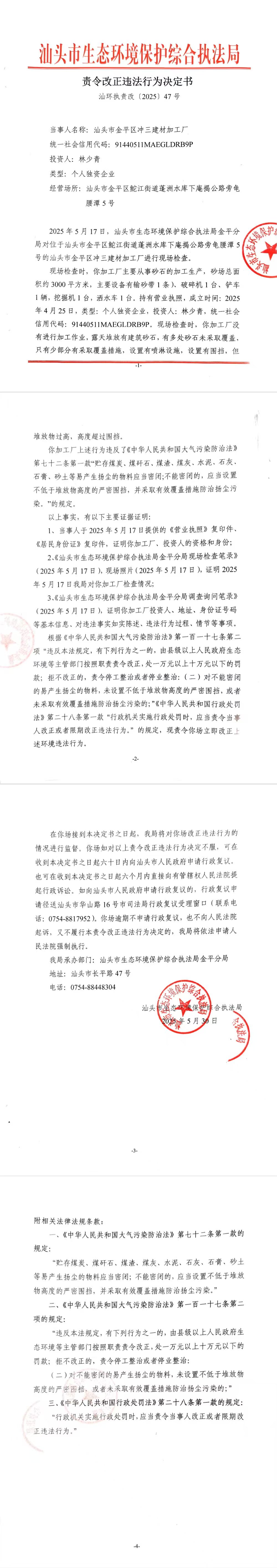 【金平】责令改正违法行为决定书(汕环执责改〔2025〕47)