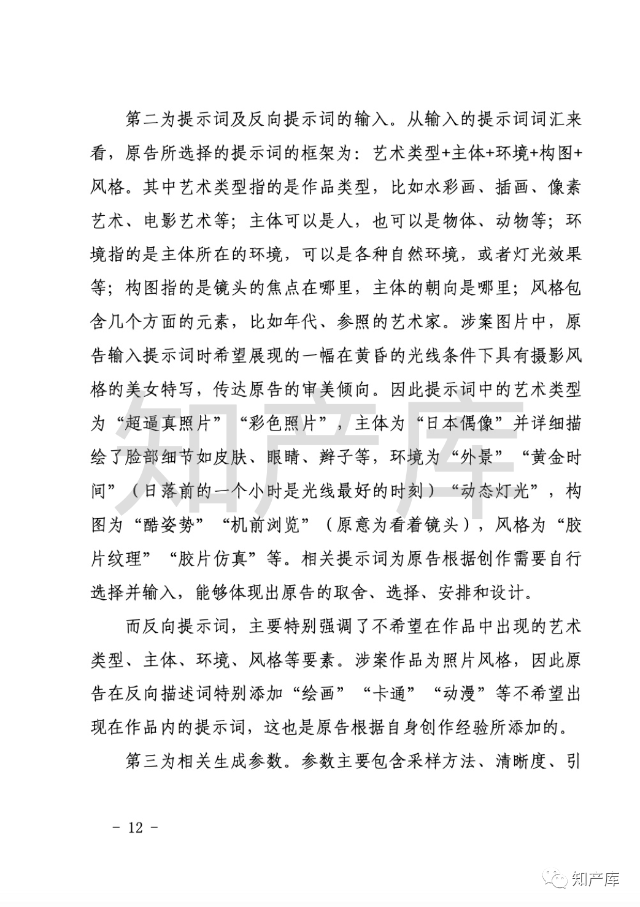 2.关于“独创性”的认定:“原告对于人物及其呈现方式等画面元素通过提示词进行了设计,对于画面布局构图等通过参数进行了设置,体现了原告的选择和安排。另一方面,原告通过输入提示词、设置相关参数,获得了第一张图片后,其继续增加提示词、修改参数,不断调整修正,最终获得了涉案图片,这一调整修正过程亦体现了原告的审美选择和个性判断......涉案图片并非“机械性智力成果”。在无相反证据的情况下,可以认定涉案图片由原告独立完成,体现出了原告的个性化表达。综上,涉案图片具备“独创性”要件。
