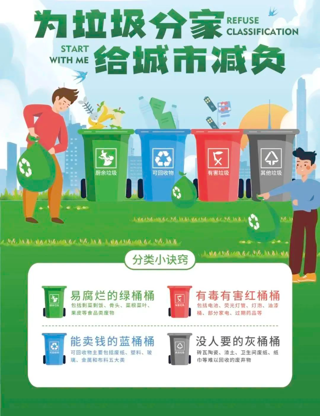 垃圾分类主要分为厨余垃圾、可回收物、有害垃圾、其他垃圾四大类。