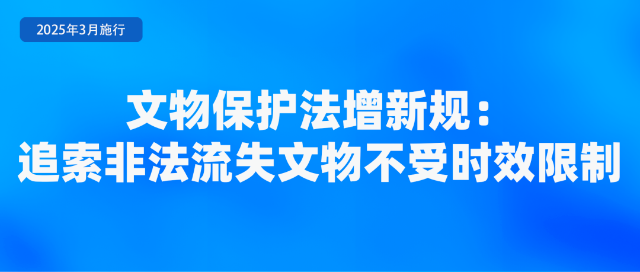 新修订的文物保护法,自2025年3月1日起施行。新修订的文物保护法不仅明确了中国开展文物追索返还的工作机制,还增加了对流失海外文物追索返还的条款。国家加强文物追索返还领域的国际合作。国务院文物行政部门依法会同有关部门对因被盗、非法出境等流失境外的文物开展追索;对非法流入中国境内的外国文物,根据有关条约、协定、协议或者对等原则与相关国家开展返还合作。国家对于因被盗、非法出境等流失境外的文物,保留收回的权利,且该权利不受时效限制。
