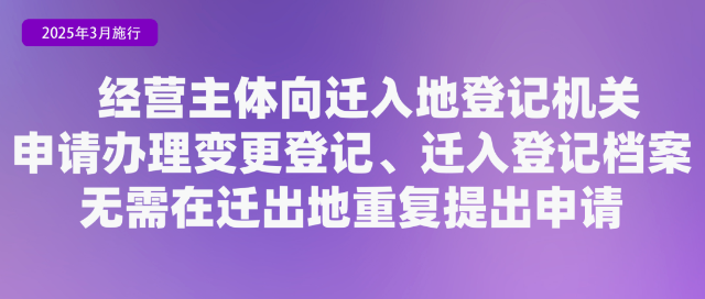 市场监管总局和国家档案局联合制定出台《经营主体登记档案管理办法》,于2025年3月20日正式施行。《办法》明确经营主体向迁入地登记机关申请办理变更登记、迁入登记档案,无需在迁出地重复提出申请;迁入地、迁出地登记机关要做好对接和档案移转,不得限制、妨碍登记档案迁移;要求持续优化迁移程序,推行登记档案迁移网上办理,明确迁入地登记机关可以通过网络调阅登记档案的,迁移期间经营主体可以直接在迁入地办理登记业务。《办法》扩大登记档案查询主体范围,新增经营主体有效登记在册的相关人员、公证、仲裁、司法鉴定等机构、破产管理人,并明确各类主体申请查询时需要提供的材料。