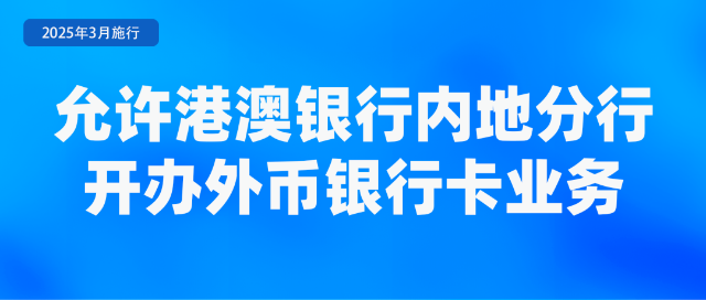 国家金融监督管理总局印发《关于港澳银行内地分行开办银行卡业务有关事项的通知》,自2025年3月1日起实施,允许港澳银行内地分行开办外币银行卡业务以及对除中国境内公民以外客户的人民币银行卡业务;明确港澳银行内地分行开办借记卡业务适用报告制,开办信用卡业务适用审批制。