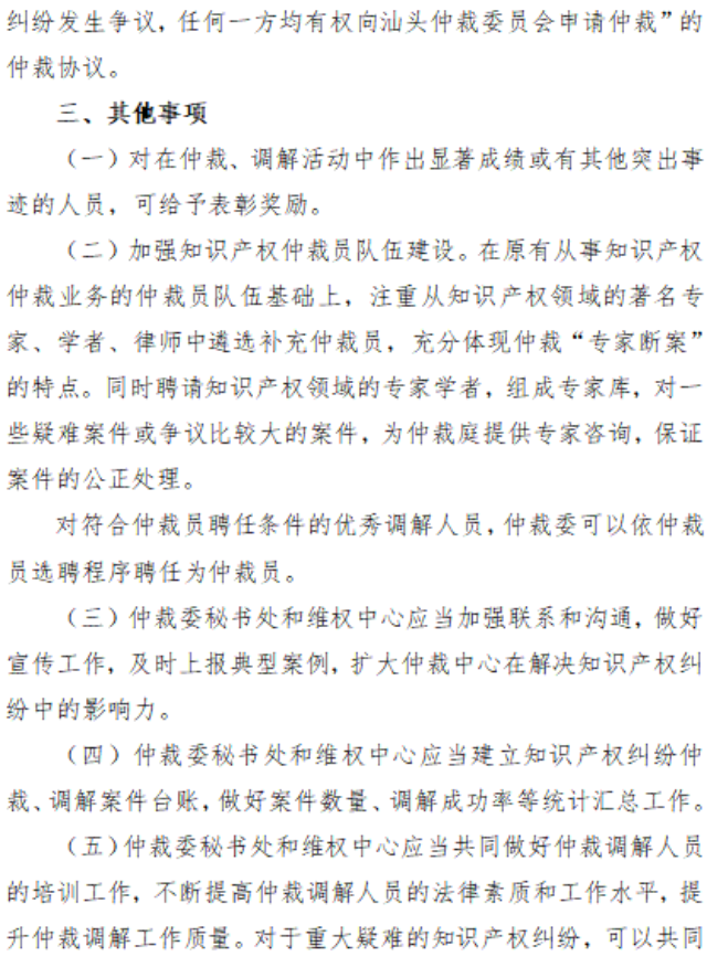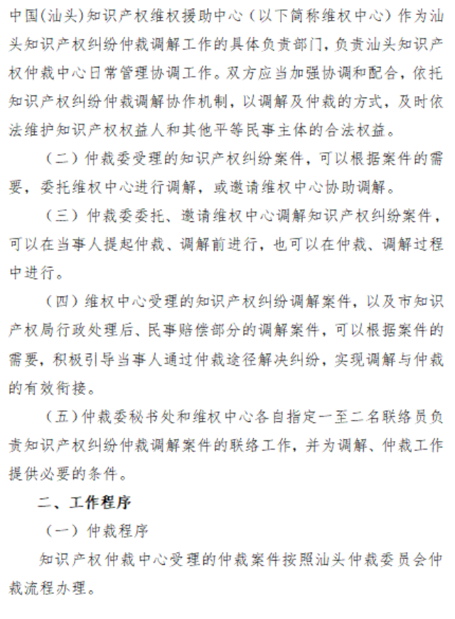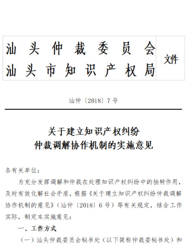 点击此处下载:关于建立知识产权纠纷仲裁调解协作机制的实施意见 汕仲〔2018〕7号.wps