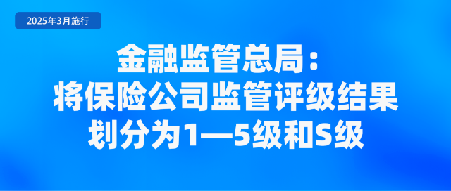 金融监管总局发布《保险公司监管评级办法》,自2025年3月1日起施行。对于保险集团(控股)公司、财产保险公司、人身保险公司和再保险公司,《评级办法》建立了统一的监管评级框架,采用一致的评级方法、评级程序和等级分类。《评级办法》规定不同类型公司的监管评级结果均为1—5级和S级,数字越大风险越大。结合评级实践和监管实际,《评级办法》设置“一票否决”机制,即公司单项风险过大将下调评级结果。监管部门根据评级结果对公司实施分类监管。