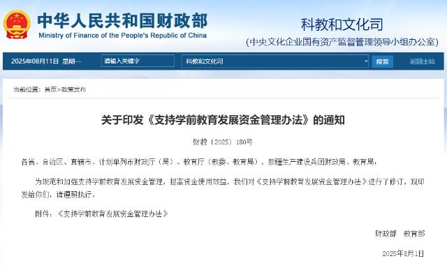 近日,财政部等修订印发《支持学前教育发展资金管理办法》,文件提出: