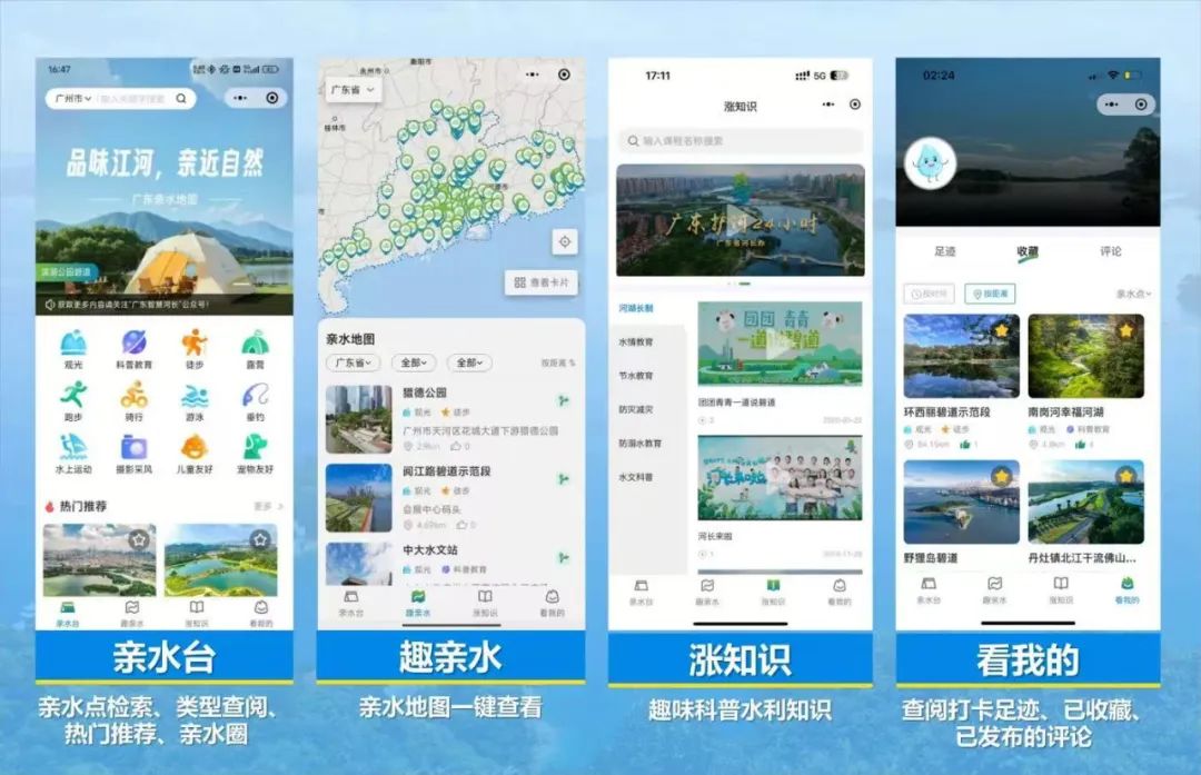 地图分为“亲水台”“趣亲水”“涨知识”“看我的”四个栏目,有信息介绍、水利科普、搜索导航、留言评论等功能,并按照适合观赏、露营、垂钓、游泳、运动、骑行、摄影等不同需求作了分类。目前,第一批上线了200多个亲水点在广州、深圳试点打造1小时亲水圈。市民进入“广东智慧河长”微信公众号、“广东河长”小程序就能使用,欢迎城乡居民共赴江河之约,共享粤水之美。