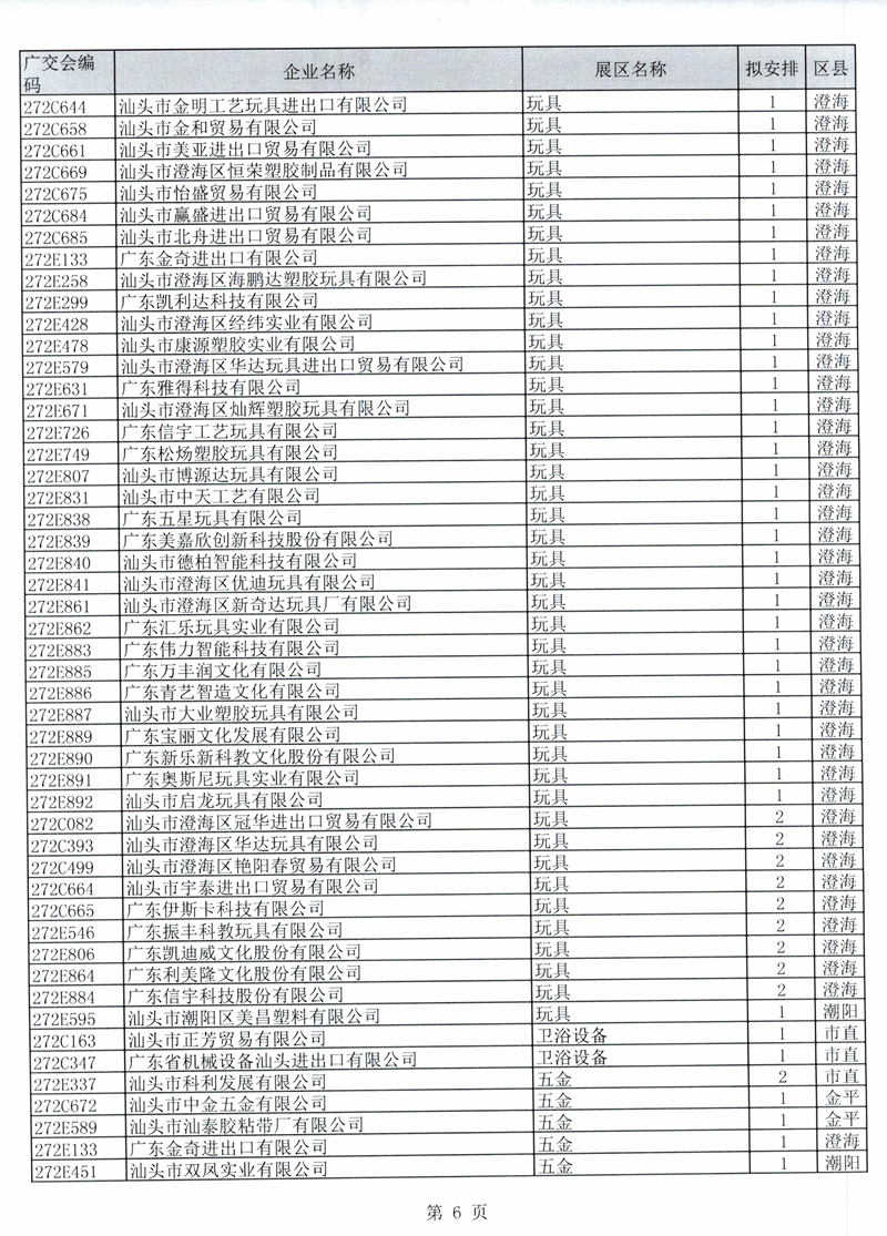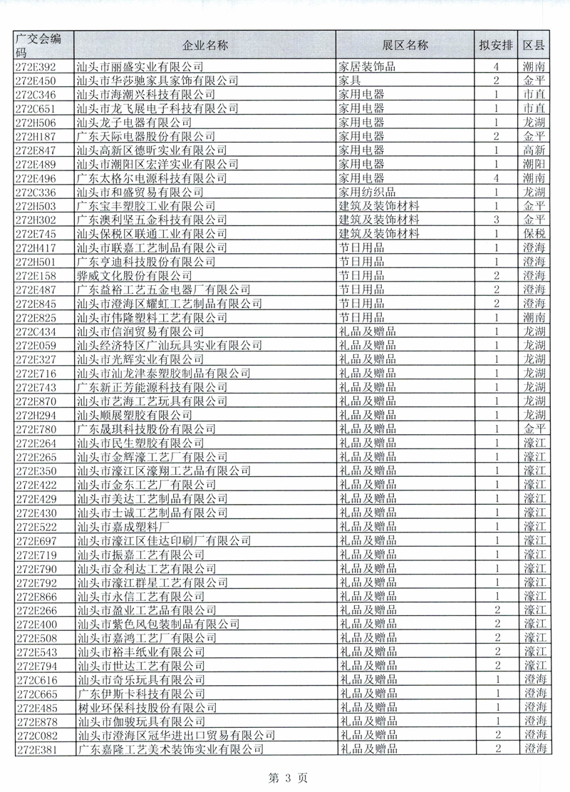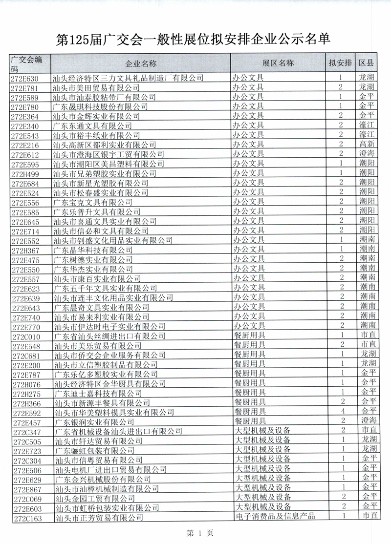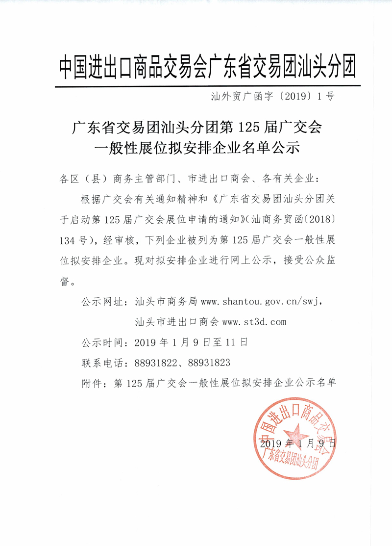 广东省交易团汕头分团第125届广交会一般性展位拟安排企业名单公示