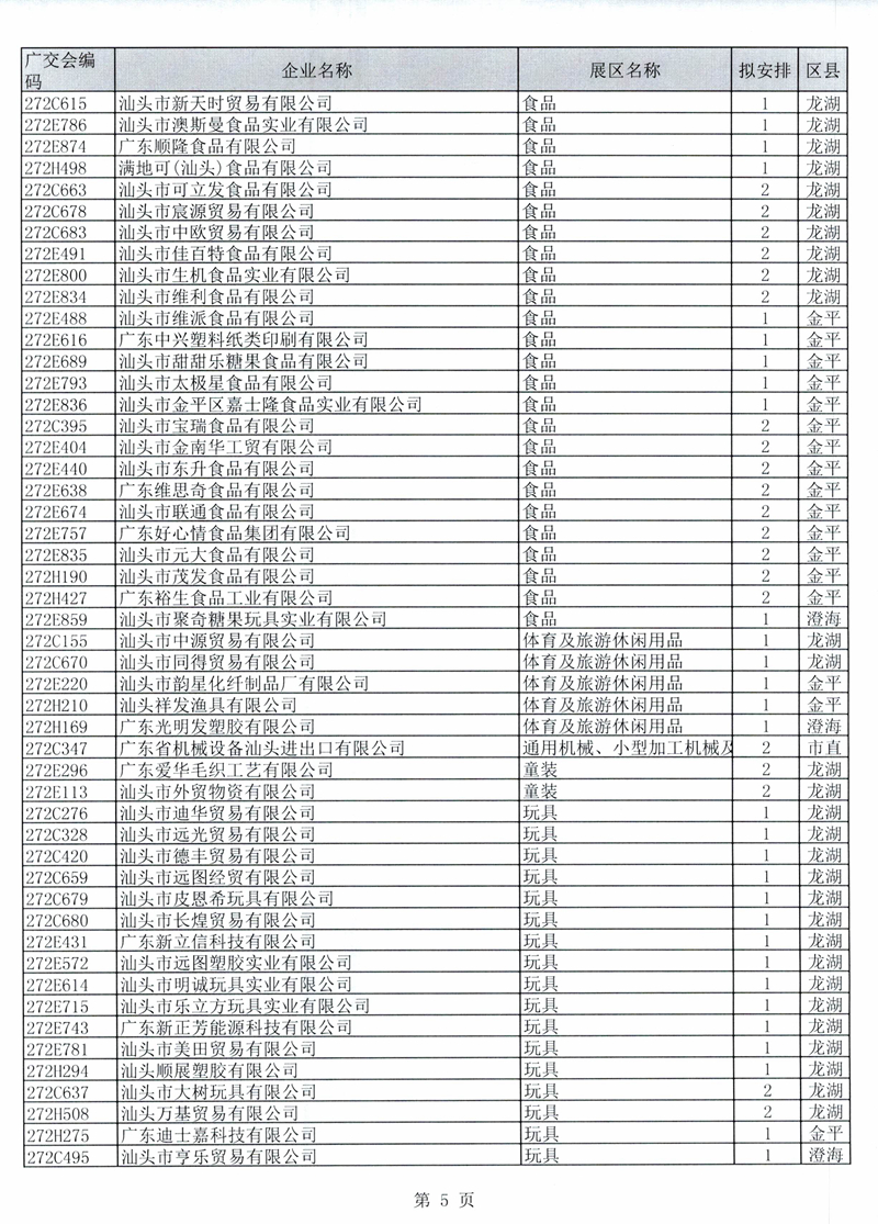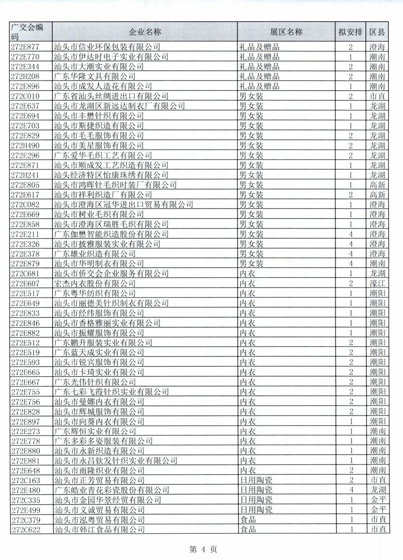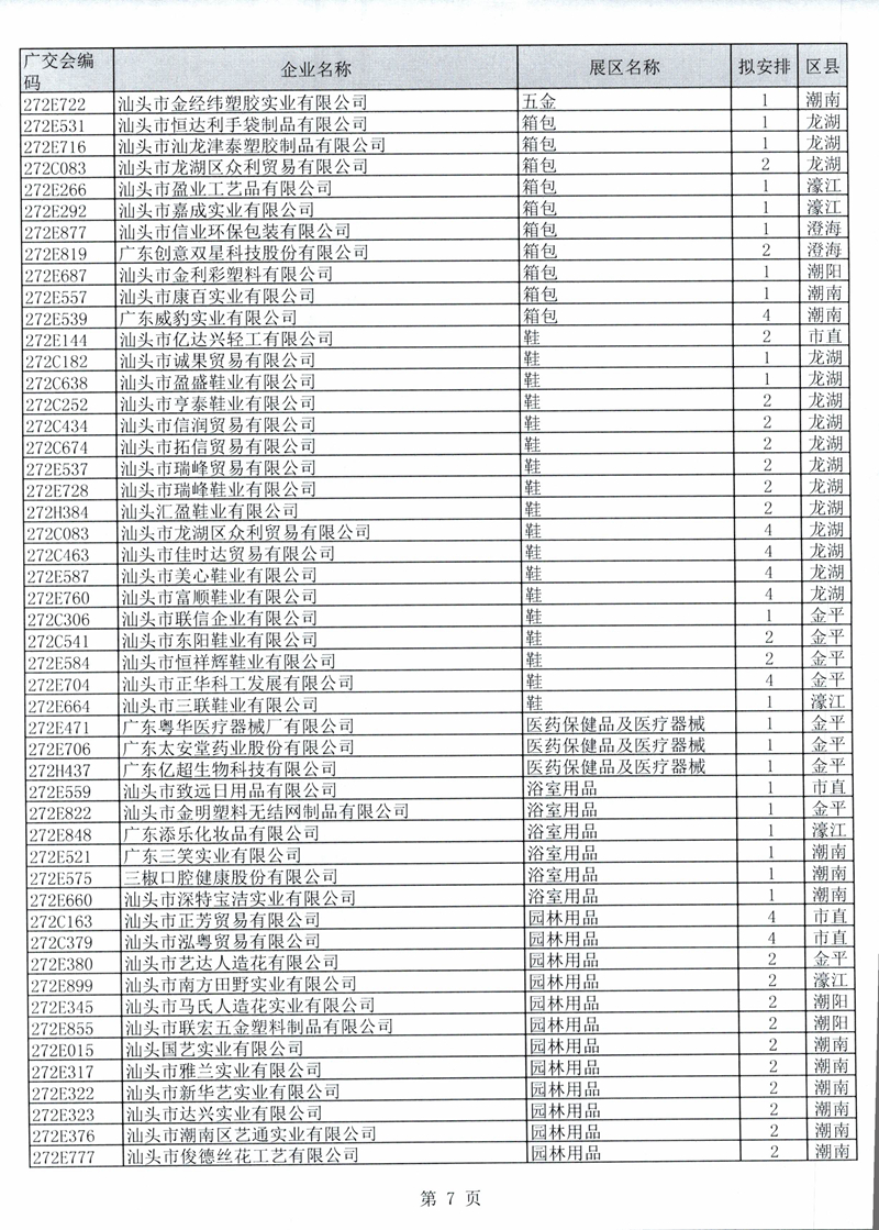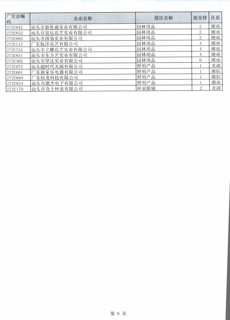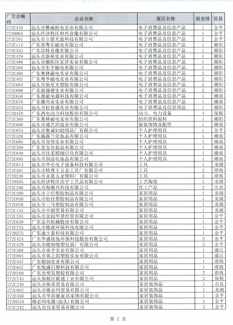 广东省交易团汕头分团第125届广交会一般性展位拟安排企业名单公示