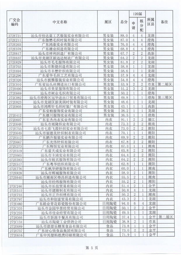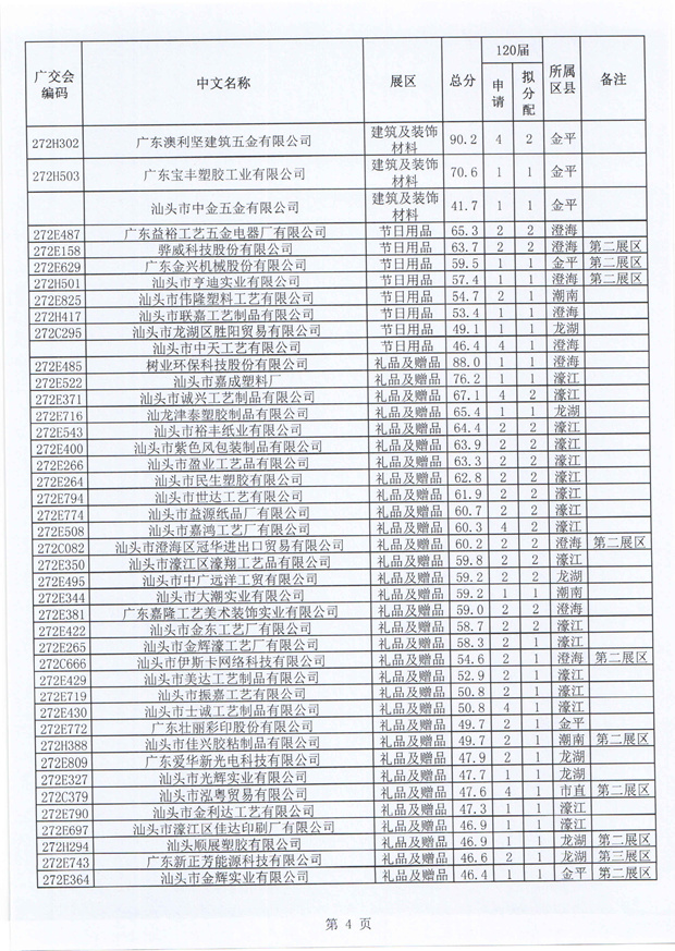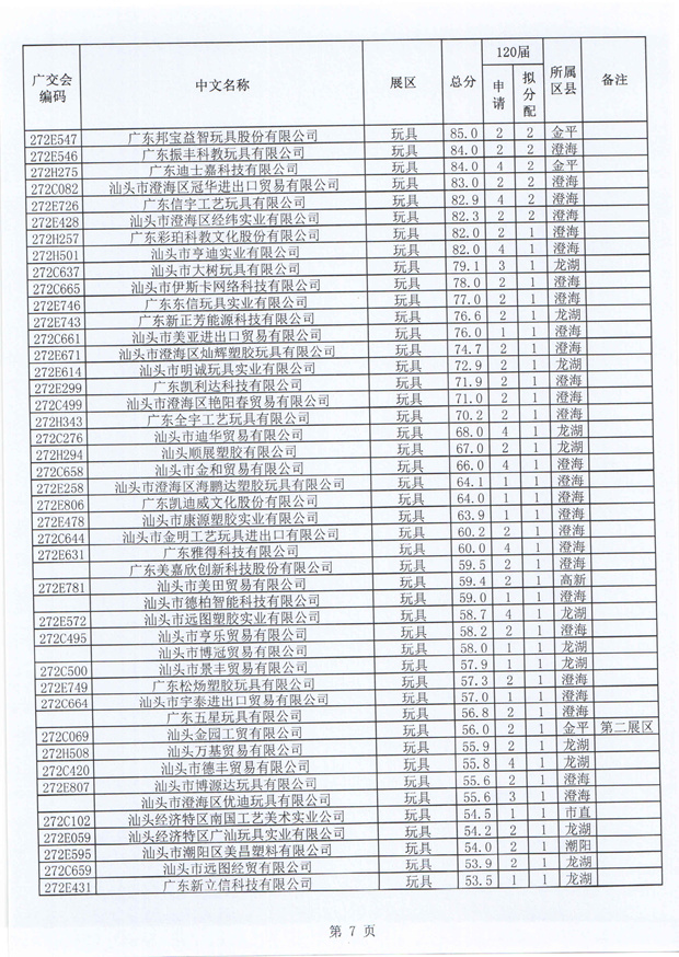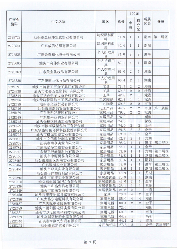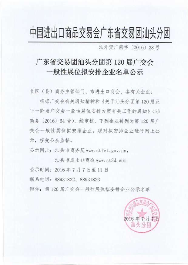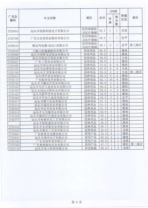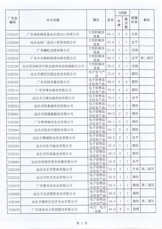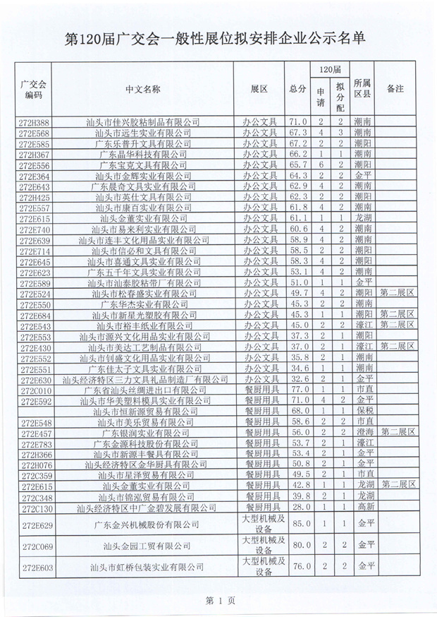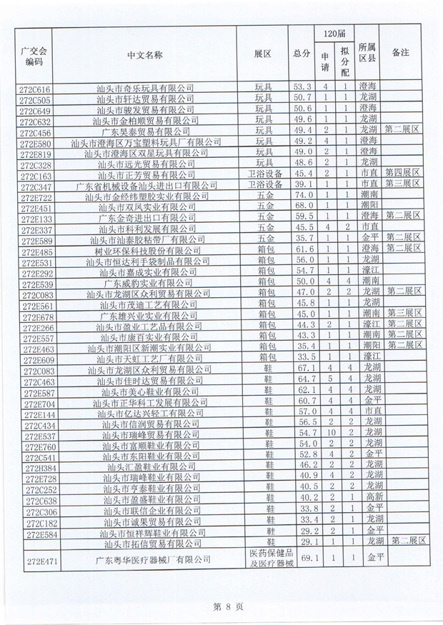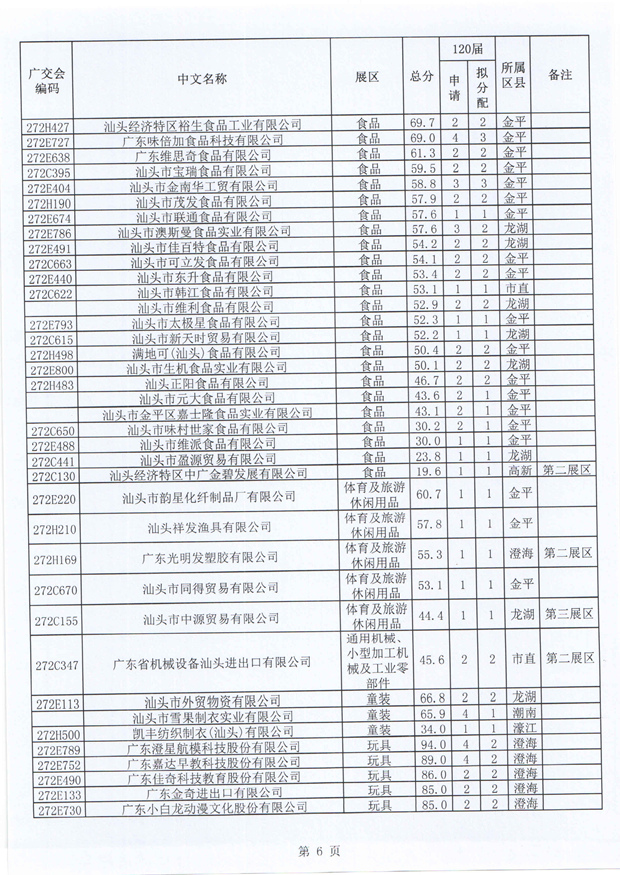 广东省交易团汕头分团第120届广交会一般性展位拟安排企业名单公示.