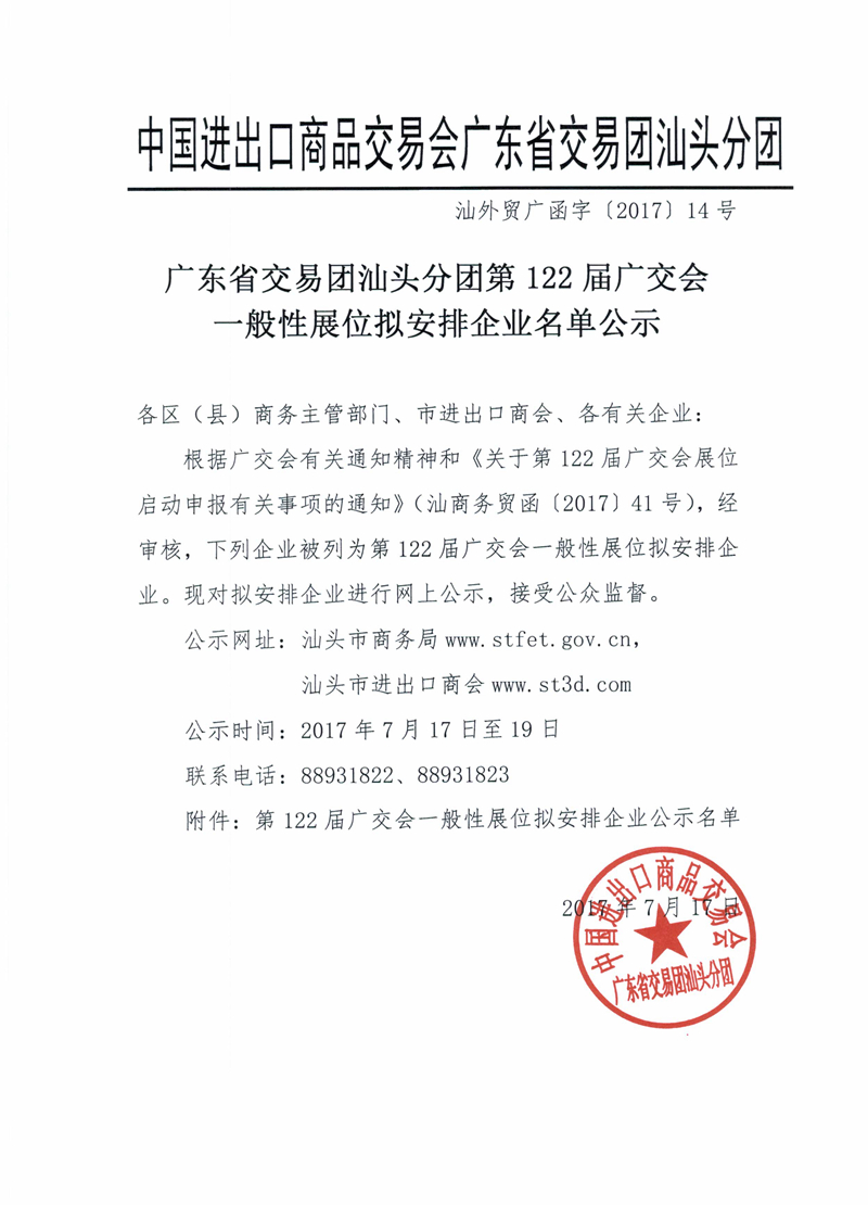 广东省交易团汕头分团第122届广交会一般性展位拟安排企业名单公示