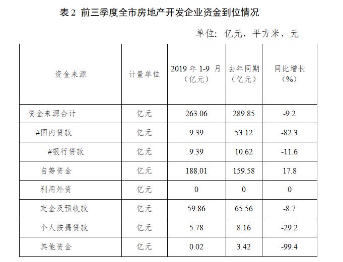 前三季度,全市房地产开发企业本年到位资金263.06亿元,同比下降9.2%。其中,国内贷款9.39亿元,大幅下降82.3%;企业自筹资金188.01亿元,增长17.8%;定金及预收款、个人按揭贷款分别59.86亿元和5.78亿元,同比分别下降8.7%和29.2%。