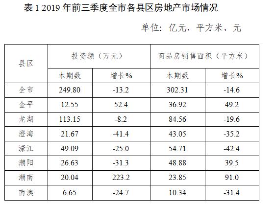 2019年前三季度,汕头市房地产开发运行情况平稳,开发投资、商品房销售面积均延续了上半年的下降趋势;企业到位资金较为紧张。汕头房地产市场进入一个调整转型期。