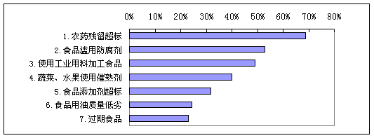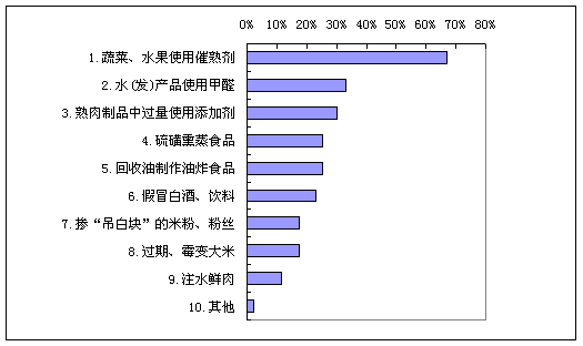 因使用催熟剂,香蕉没有了过去的清香,西红柿失去了往日甜美,大棚蔬菜和反季节果蔬繁荣了市场,但因生长期短,营养和口感会有损失。有的农民为抢销售期,大量使用化肥、激素、农药导致农产品超常生长,虽提高了农产品产量,但也改变了农产品的品质。使农产品口感和安全性变差,甚至会对市民的健康和生命构成威胁。水(发)产品使用甲醛作防腐剂、熟肉制品中过量使用添加剂,不仅对人体肝、肾等内脏有严重损害,而且一次性食用剂量过多,会有生命危险。市民认为对身体危害最大的食品问题是:农药残留超标、食品滥用防腐剂、使用工业用料加工食品等。(见下图)