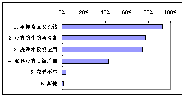 在食品消费过程中,部份经营者的不卫生行为使市民极为反感。市场里经常见到,卖熟肉制品的经营者切好肉往袋里装,手顺势在旁边的一条油腻的脏毛巾上擦了一下,就开始收钱。路边摊挡因不具备卫生用水条件,使用过的盘碗反复在一两个盆子里洗涮。还有市场里的熟肉制品无遮盖摆放,没有防尘防蝇设备,任由蚊蝇虰咬。市民反感的不卫生行为排列如下: