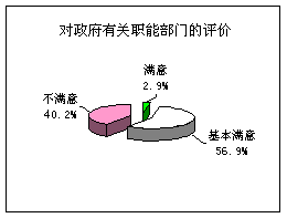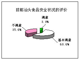 近年来,我市各部门积极行动,开展了查处劣质奶粉、劣质散装白酒等专项清理行动,取得了一定的成效,但是和市民对食品安全的要求还是有距离。针对我市目前的食品安全状况市民的满意程度较低,表示满意的只占3.8%,基本满意的占60.6%,不满意的占35.6%。市民对政府有关职能部门的监管工作评价也明显偏低,表示满意的占2.9%,基本满意的占56.9,不满意的占40.2%。(见下图)
