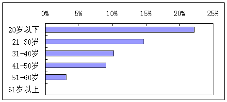 在调查中,市民针对近期频频发生的食品安全事件,给予高度关注,纷纷提出自己的看法和建议。近九成市民对于市面上的食品安全问题表示担心,只有12.9%的市民对身边的食品质量有信心。另外,有90.8%的市民对自己购买的食品表示不太放心,对购买食品有信心的市民不到一成。这说明市民对于食品安全,普遍产生信心危机。有趣的是随着年龄增大,对食品安全越没信心。(见下图)