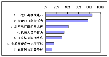 调查显示,市民认为造成目前食品问题频出的根本原因是:不法厂商利欲熏心(占84.9%),管理部门监管不力(占77.1%),对不法厂商惩罚太轻(41.3%),执法人员不作为(占33.9%),现有法规漏洞太多(占29.8%),食品管理宣传力度不够(占14.7%),媒体舆论监督不够(占11.5%)(见下图)