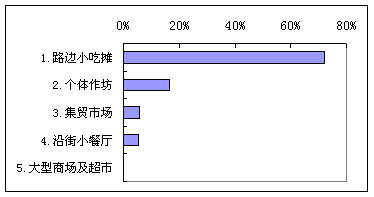 调查中,市民最不满意的食品消费场所是路边小吃摊和个体作坊。各类烧烤摊、肠粉摊、粿汁摊挡占路为市,搞得乌烟瘴气,食品卫生一点保证也没有,市民意见很大。市民反映,一些制作馒头、糕点、豆制品、熟肉制品等个体作坊,不仅原料质量得不到保障,加工方式和操作环境更差,苍蝇乱飞,污水遍地。宰杀畜禽的摊挡普遍肮脏不堪,加工脱毛用的热水锅里,热水浑浊不清,气味难闻,各种畜禽的毛零碎的浮在锅面上,看了令人恶心。对这些地方的食品只能是睁一只眼闭一只眼,显得好无奈。而市民对大型商场及超市的满意程度较高。(见下图)