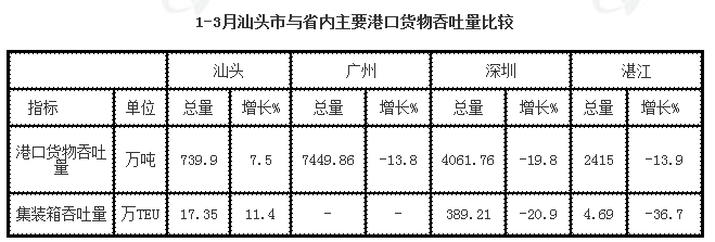 交通运输逆势增长。一季度,交通运输业呈现良好发展态势,全市货运量、货物周转量分别增长5.8%和13.4%。特别是港口货运,在全省主要大港增速纷纷下降的情况下,我市逆势增长(见下表)。前三个月全市港口货物吞吐量达到739.9万吨、集装箱吞吐量17.35万标箱,分别增长7.5%和11.4%,两项增速均大幅快于广州、深圳、湛江等主要港口。
