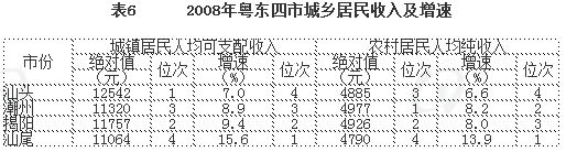 从2008年粤东四市城乡居民可支配收入来看,汕头为12542元,居第首位;汕尾为11064元,居最后一位;汕头比汕尾高出13.4%。从农村居民人均纯收入看,四市比较接近(见表6)。总体上看,粤东四市之间差距不大,但与全省平均水平相差较大,如城镇居民可支配收入最高的汕头,比全省平均水平(19733元)低7191元;而农村居民人均纯收入最高的潮州,比全省平均水平(6399元)低1422元。