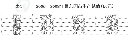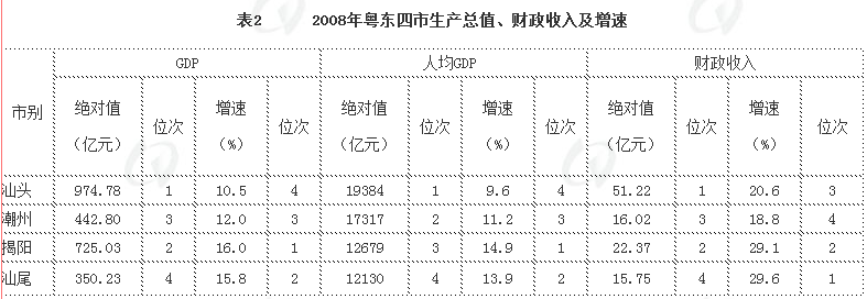 粤东四市,行政上包括汕头、潮州、揭阳、汕尾4个地级市。2008年,粤东四市土地面积合计15675.6平方公里,占全省8.7 %;人口密度1125人/平方公里,比全省的460人/平方公里高出近两倍,是全省人口最稠密地区之一;年末总人口1763.1万人,占全省21.3 %;GDP合计2492.8 亿元,仅占全省7.0%;人均生产总值15396元,是全省平均水平的41%;地方财政一般预算收入105.4亿元,占全省的3.2%。从主要数据可以看出,粤东地区在全省发展格局中步伐相对滞后,仍属广东省经济欠发达地区。