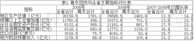 2006年9月省粤东地区工作会议吹响了加快粤东发展的号角,近两年来粤东地区经济总体上获得较快发展。从2008年经济运行指标初步核算数据来看,粤东地区受到金融危机的影响相对较小,经济增长相对较快,GDP占全省的比重进一步上升。2008年粤东四市生产总值2492.8亿元,平均增速达13.0 %,比2007年回落2.3个百分点,高出全省增速2.9个百分点;2007-2008年均增速14.2%,高出全省年均增速1.9个百分点;GDP总量占全省的7.0%,均比2006、2007年提高0.2个百分点。工业快速发展,工业化水平不断提高,2007-2008年规模以上工业增加值年均增速达到23.7%,高出全省年均增速9.8个百分点(见表1)。从拉动经济增长的“三驾马车”来看,2007-2008年,粤东四市的固定资产投资总额、社会消费品零售总额和出口总额年均增长23.1 %、21.2 %、10.6%,分别高出全省年均增速5.8、2.8、-5.1个百分点。