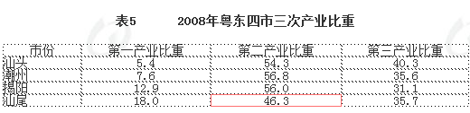 就粤东地区整体的产业结构来看,均呈现为二三一结构(见表5),但第三产业比重明显低于全省平均水平(全省三次产业比重为5.5:51.6:42.9),说明粤东地区服务业发展水平相对落后。从四市之间比较,汕头、潮州、揭阳第二产业所占比重较大,分别达54.3%、56.8%和56%,说明工业化水平较高,可以说已处于或接近工业化中期阶段;汕尾第一产业所占比重高达18%,居四市之首,表明工业化、城镇化水平相对较低;汕头第三产业所占比重远高于其他三市,达40.3%,表明产业结构更为优化和经济发展现代化程度更高。