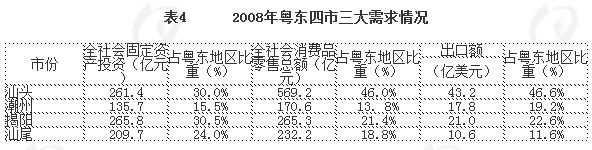 粤东四市均以内向型经济和民营经济为主,但从拉动经济增长的“三驾马车”投资、消费和出口来看,四市经济增长的动力各有侧重。从消费和出口看,2008年汕头的全社会消费品零售总额和出口额分别为569.2亿元和43.2亿美元,分别占四市的46%和46.5%,远远超过其余三市的同类指标(见表4),具有明显的绝对优势,是拉动经济增长的主要力量。从2008年固定资产投入来看,揭阳、汕头、汕尾三市总量比较接近,但汕头的投资率为27%,远低于潮州(32%)、揭阳(37%)、汕尾(60%),投资力度明显不足。从外贸角度看,经测算(按2008年12月31日美元对人民币汇率6.8346折算)2008年粤东四市外贸依存度分别为:汕头44.2%、潮州34.4%、揭阳23.2%、汕尾38.2%。虽然汕头外贸依存度明显高于其余三市,但还远远低于全省平均水平(133%)。