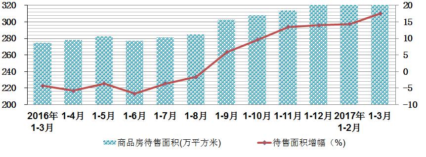 截至一季度末,全市商品房待售面积322.7万平方米,比上年同期增加48.21万平方米,同比增长17.6%(见图3)。
