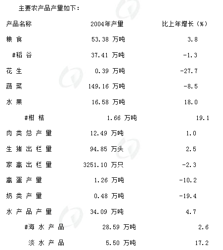 农业基础地位得到加强。种植业结构继续调整优化,粮食生产能力进一步提高。林业生态环境建设取得新进展。畜牧业生产克服了年初禽流感疫情的不利影响,总体上保持稳步发展。渔业生产持续增长。农业产业化继续推进,农业标准化工作取得明显成效。全年农业增加值50.97亿元,比上年增长2.7%;农业总产值80.56亿元,增长1.1%。