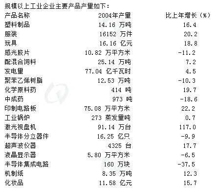 对外贸易快速增长。据海关统计,2004年全市进出口总额41.79亿美元,比上年增长24.9%。其中进口总额16.34亿美元,增长12.4%;出口总额25.45亿美元,增长34.5%。在出口总额中,一般贸易出口16.53亿美元,增长35.4%;近、远洋贸易出口增长37.7%,占全部出口贸易的71.5%,比上年提高1.6个百分点;“三资”企业和私营企业的出口额占全市出口总额的83.0%,比上年提高2.5个百分点。主要大宗出口商品中,服装、玩具、塑料制品和机电类产品出口分别增长33.5%、44.0%、42.7%与49.4%。进出口总额靠前的国家和地区依次为:香港、日本、美国和欧盟,分别达到7.71亿美元、6.07亿美元、5.59亿美元与4.93亿美元。