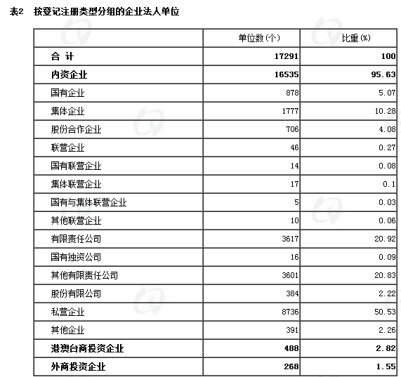 2008年末,全市共有企业法人单位17291个,比2004年末增加2736个,增长18.8%。按登记注册类型分,国有企业、国有联营企业、国有独资公司共710个,比2004年末下降80.3%;集体企业、集体联营企业、股份合作企业共2500个,比2004年末下降44.1%;其他有限责任公司、股份有限公司共3985个,比2004年末增长83.9%;私营企业8736个,比2004年末增长47.0%;其他内资企业391个,比2004年下降82%;港澳台商投资企业和外商投资企业756个,比2004年末增长23.1%。(详见表2)