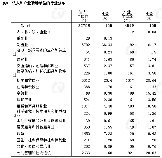 产业活动单位较为集中的5个行业是:制造业,占4.17%;批发和零售业,占28.64%;公共管理和社会组织,占20.03%;租赁和商务服务业,占10.5%;金融业,占15.42%。以上五个行业合计占78.76%。(详见表4)