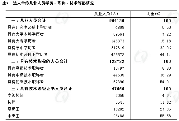 在法人单位从业人员中,具有研究生及以上、大学本科、大专、高中、初中及以下学历的人员分别占0.5%、7.22%、15.18%、32.96%和44.14%;具有技术职称的人员占12.73%;具有技术等级证书人员占4.94%。(详见表7)