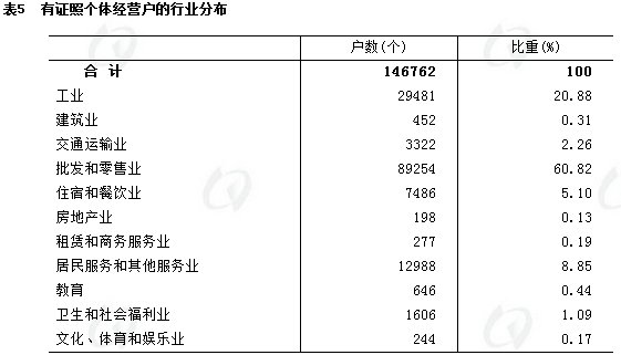 个体经营户较为集中的五个行业是:工业,占20.88%;交通运输业,占2.26%;批发和零售业,占60.82%;住宿和餐饮业,占5.1%;居民服务和其他服务业,占8.85%。(详见表5)