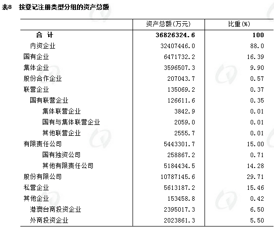 2008年末,全市第二、三产业企业法人单位资产总额为36826324.6万元,与2004年末相比,增加12284080万元,增长50.02%。按登记注册类型分,国有企业资产总额6471732.2万元,比2004年下降28.06%;集体企业资产总额3596507.3万元,比2004年末增长113%;股份合作制企业资产总额207043.7万元,比2004年下降73.3%;私营企业资产总额5613187.2万元,比2004年末增长79.0%;港澳台商投资企业资产总额2395017.3元,比2004年末下降13.1%;外商投资企业资产总额2023861.3万元,比2004年末增长5.0%。(详见表8)