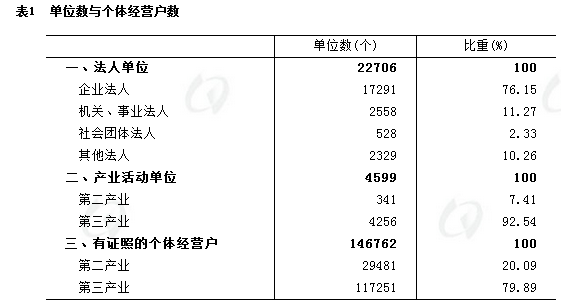 2008年末,全市共有从事第二、三产业的法人单位22706个,产业活动单位(非法人产业单位)4599个。与2004年第一次全国经济普查相比,法人单位增加3478个,增长18.1%;产业活动单位(非法人产业单位)增加1663个,增长56.6%。全市个体经营户146762户,与2004年第一次全国经济普查相比,增长38.1%。其中,第二产业29481户,第三产业117251户。(详见表1)