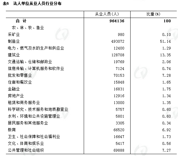 在法人单位从业人员中,制造业占51.14%,批发和零售业占7.29%,建筑业占13.38%,公共管理和社会组织占7.27%,教育占6.92%, 租赁和商务服务业占1.35%。以上六个行业合计占87.47%。(详见表6)