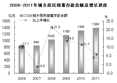 2011年,全市金融机构(含外资)年末本外币存款余额1989.01亿元,比年初增加115.15亿元,比上年下降53.8 %。其中,单位存款余额527.47亿元,比年初增加17.04亿元,下降82.5%;个人存款余额1402.04亿元,比年初增加95.49亿元,下降30.5%。金融机构(含外资)年末本外币贷款余额728.18亿元,比年初增加66.66亿元,比上年下降26.8%。其中,境内贷款726.88亿元,比年初增加67.05亿元;境外贷款1.30亿元。比年初减少0.39亿元。在金融机构(含外资)人民币的中长期贷款中,个人消费贷款85.69亿元,比年初增加13.66亿元,比上年下降4.6%。银行结汇收入53.68亿美元,增长20.3%。
