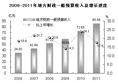全市地方财政一般预算收入85.58亿元,一般预算支出157.57亿元,分别增长17.8%和31.5%。