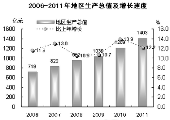 初步核算,2011年全市生产总值1403.44亿元,比上年增长12.2%。其中,第一产业增加值71.15亿元,增长3.5%;第二产业增加值792.22亿元,增长13.6%;第三产业增加值540.06亿元,增长11.2%。三次产业结构由上年的5.3∶56.1∶38.6调整为5.1∶56.4∶38.5,第一、三产业比重下降,第二产业比重提高。在第三产业中,批发和零售业增长11.1%,住宿和餐饮业增长5.4%,金融业增长6.3%,房地产业增长6.0%。民营经济增加值850.53亿元,增长11.9%。全市人均GDP 25958元,比上年增长10.1%。